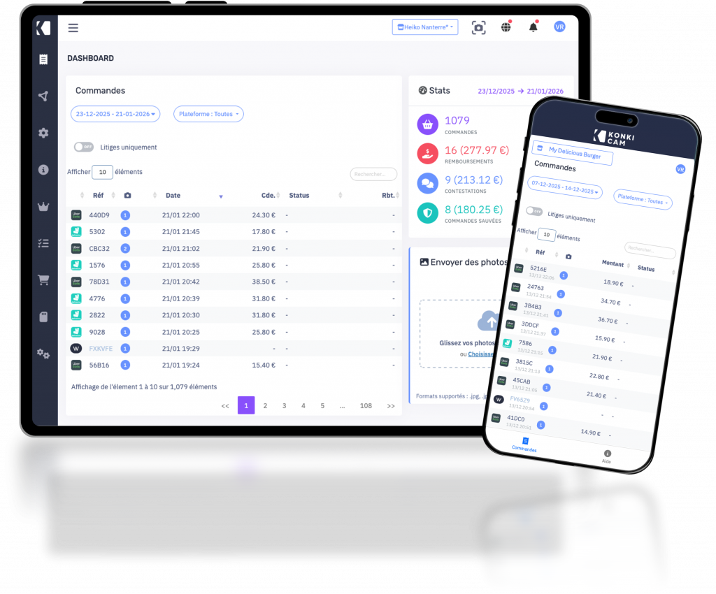 La KonkiCam est connectée (wifi 2.4Ghz) au Cloud de Konki Labs pour le transfert et la sauvegarde sécurisée de vos preuves. Un Tableau de Bord (Dashboard) vous permet de retrouver en 1 clic toutes vos commandes, les photos associées et le statut des contestations et remboursements*.